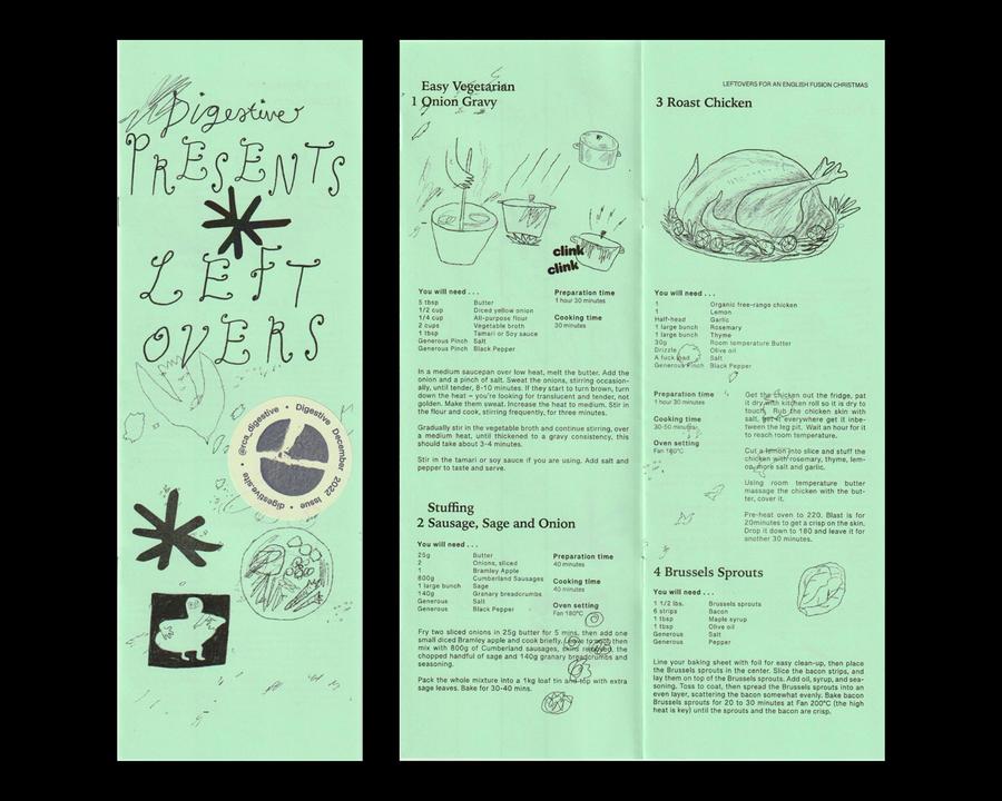 Digestive, born (2022) out of a love of biscuits and chatting, is a monthly reflective publication from the Visual Communication BR13 studio at the Royal College of Art. We create content based on the collective theme of the month—designed, collected, and shared on a single piece of paper.