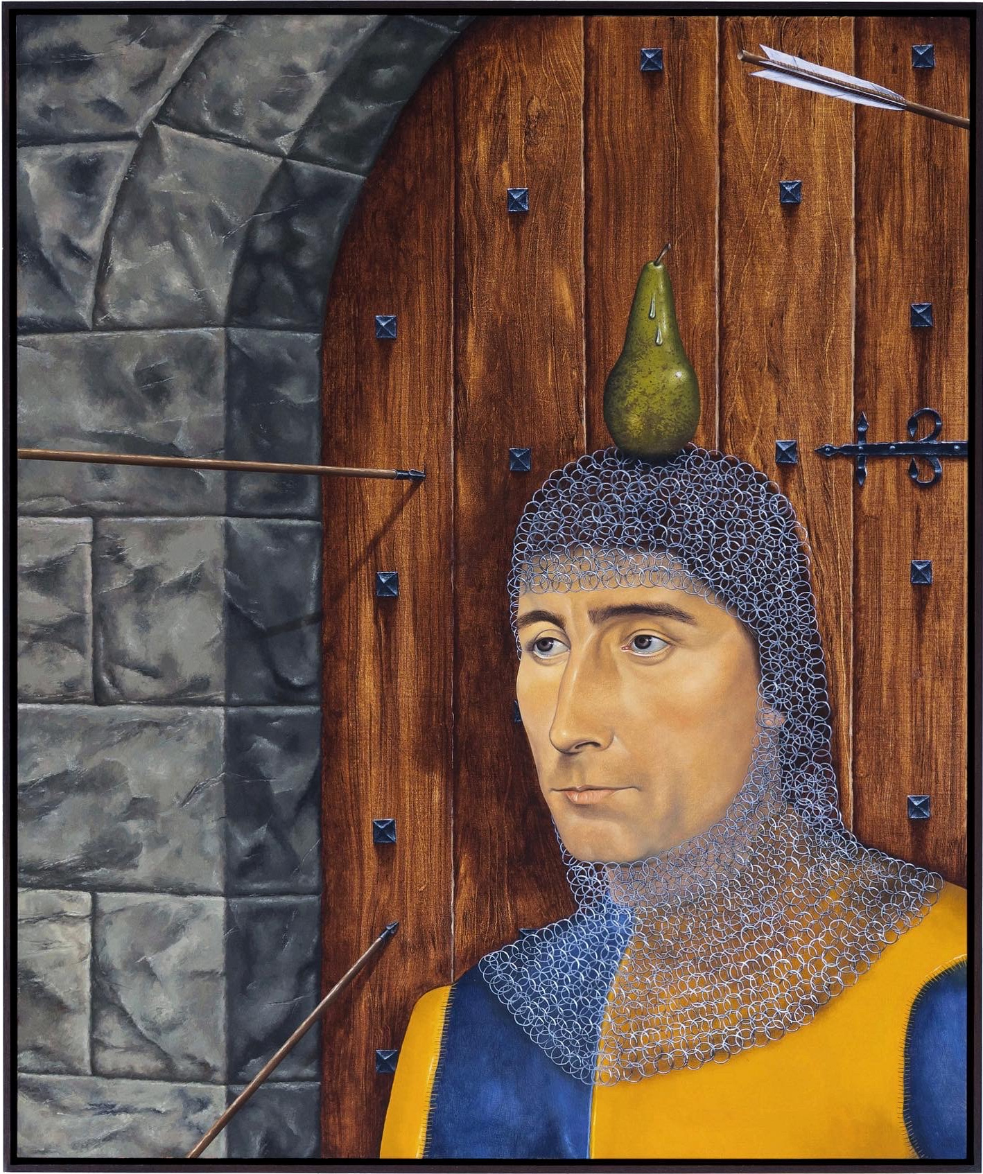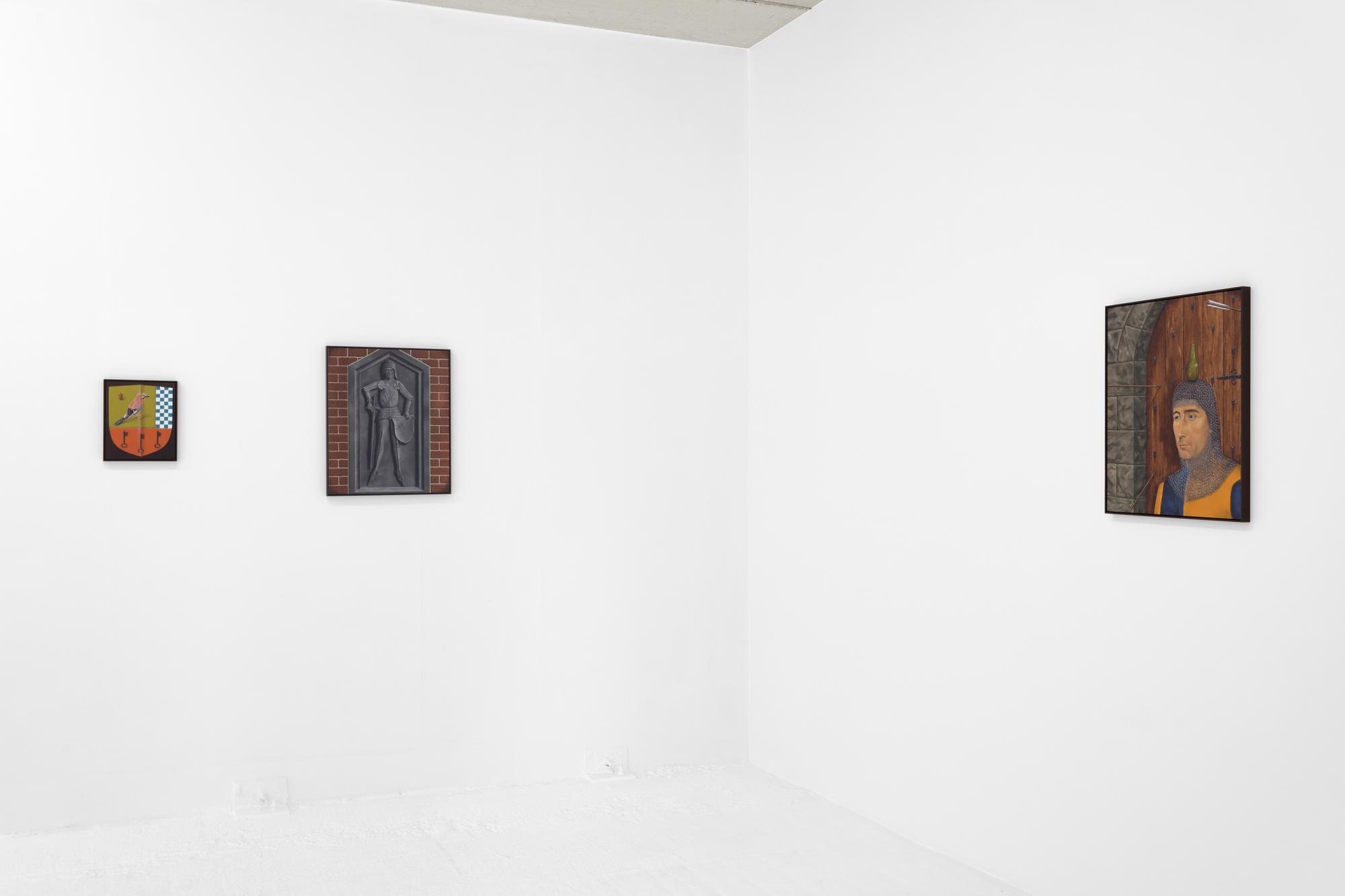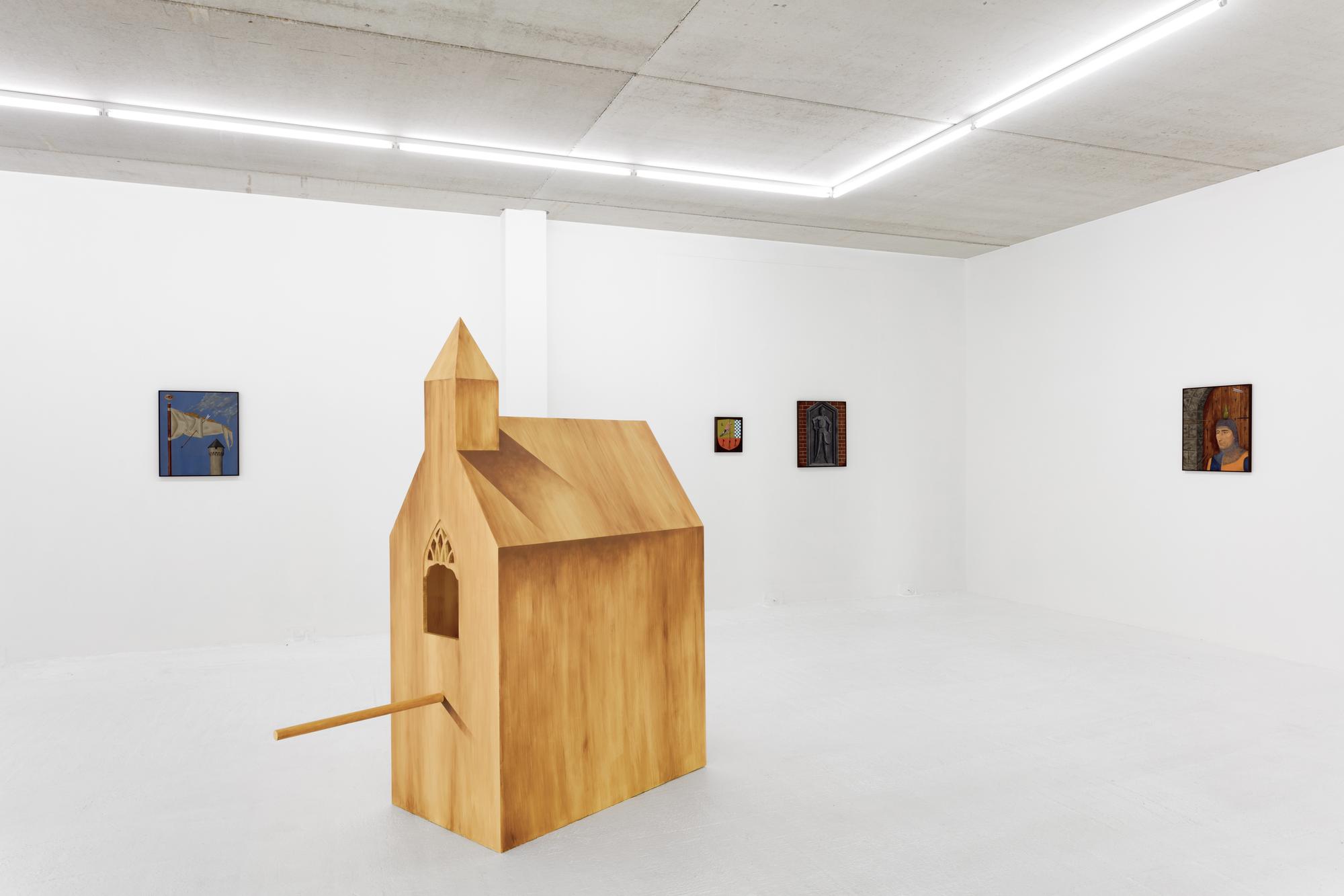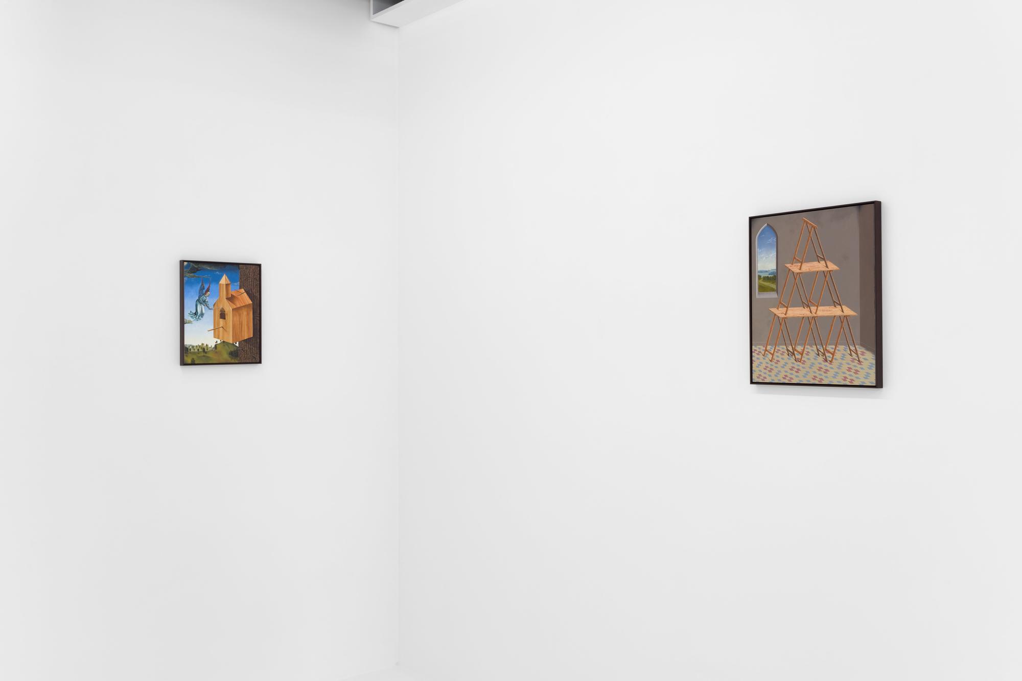 Making its colors slightly darker through the addition of minimal amounts of black paint, he is able to counter the overly brightening effect and visual depth that a glazing can achieve; and at the same time, it binds the colors in his work together. Viane creates a representation of reality that feels uncannily realistic in its pictorial detail, but is full of visual paradoxes and subtle irony. The use of a strangely deformed perspective, for example, allows him to combine a depiction the full frontal and side view of the objects in his paintings. This explains the estranging effect of An Angel’s Nest (2022) and Trestle of Trestles (2022), where we see the birdhouse and the trestles from angles that would normally exclude each other. Combined with the highly realistic depiction of the wood and the gradient skies, these paintings become the setting for subtly unsettling situations.